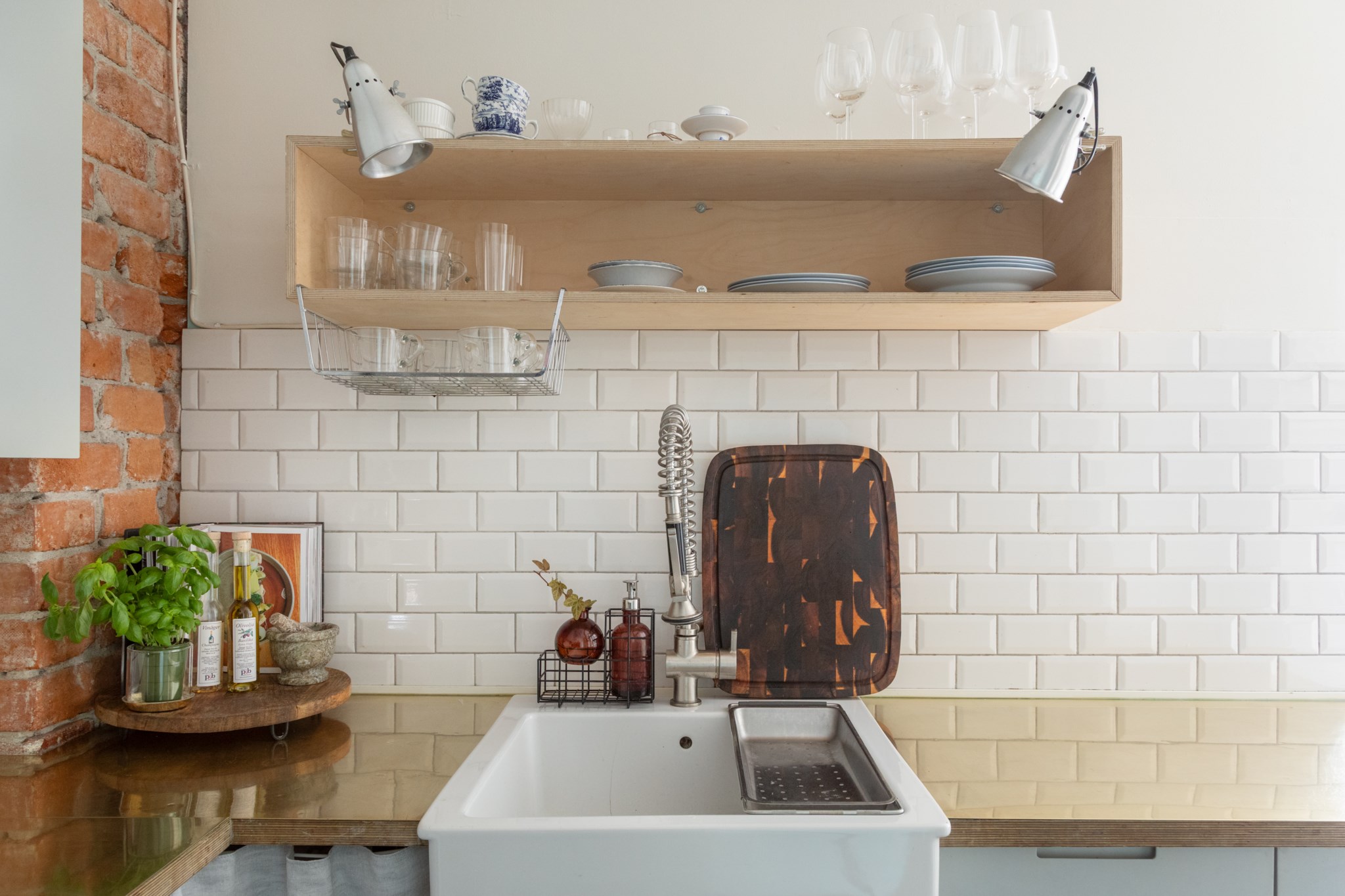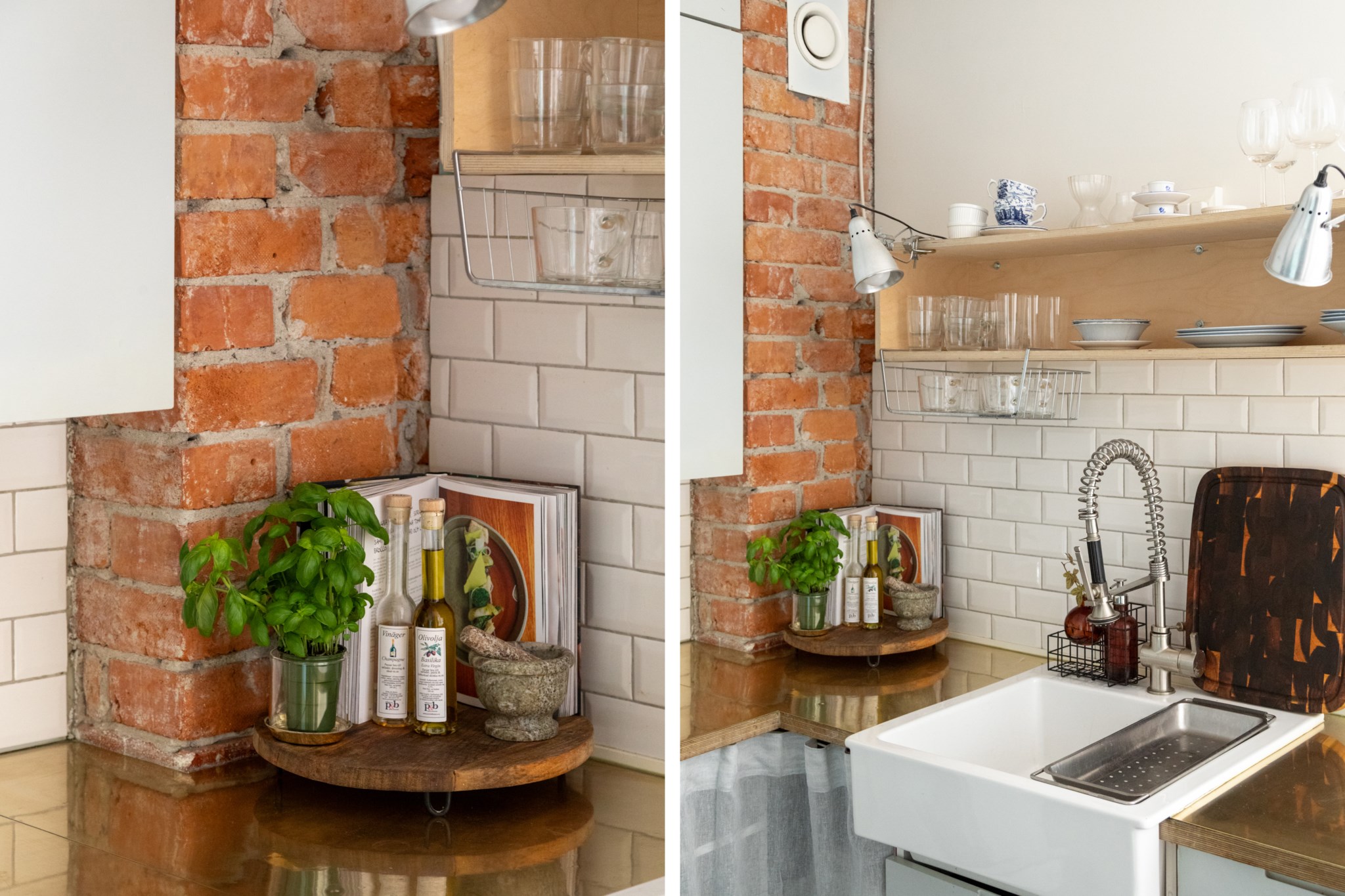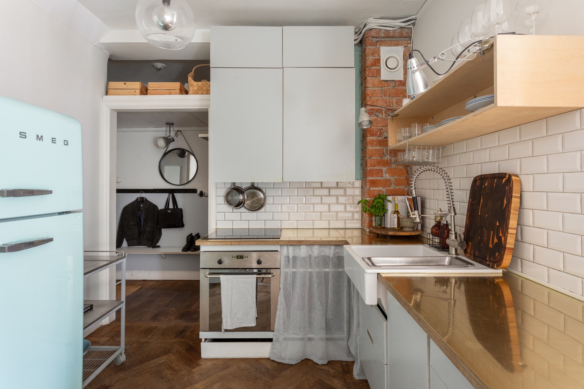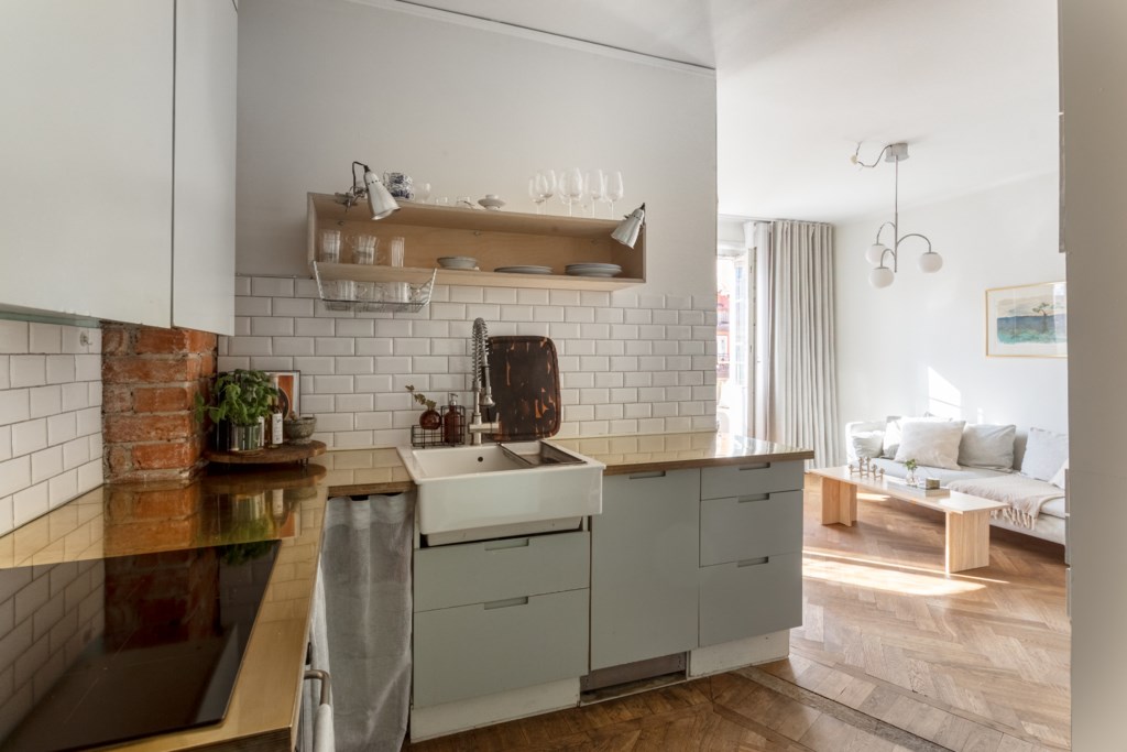 Modernt kök med smakfulla materialval bestående av ljusa köksluckor och bänkskiva med stänkskydd ovan i vitt. Den maskinella utrustningen består av diskho, diskmaskin, spis, ugn, köksfläkt samt kyl och frys. Tidlösa ytskikt bestående av ljusa väggar och mörk fiskbensparkett.