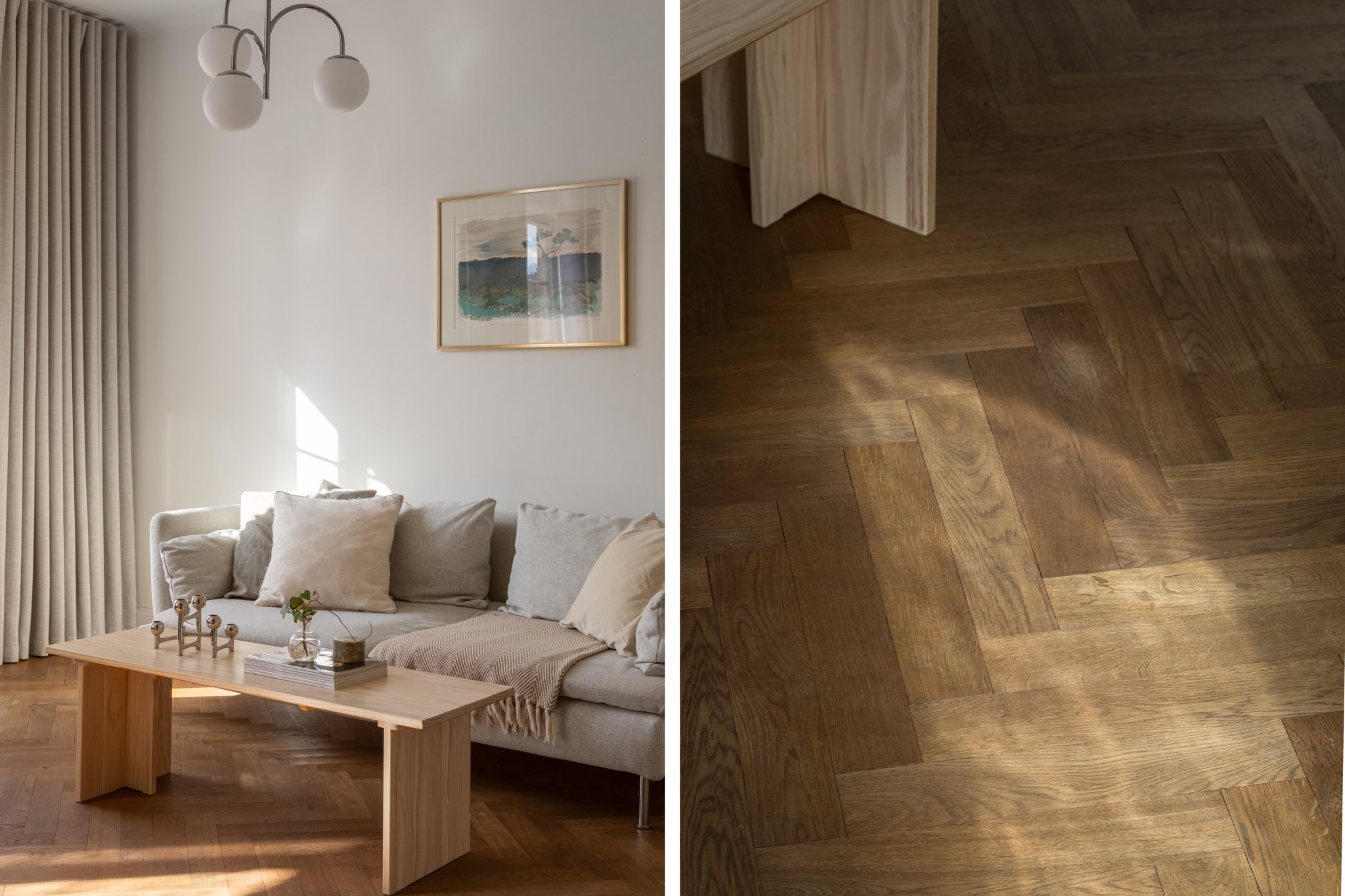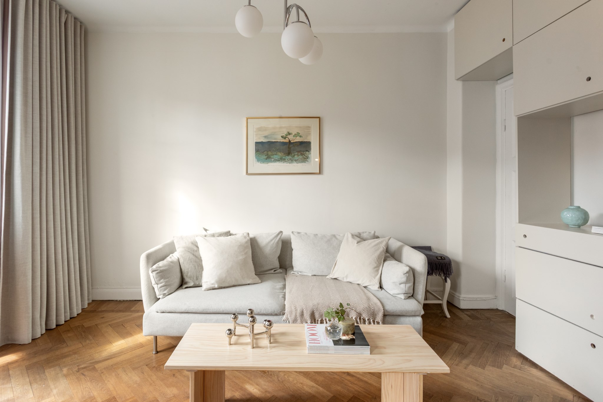 Luftigt vardagsrum med tidlösa ytskikt bestående av ljusa väggar och mörk fiskbensparkett. I vardagsrummet inryms matgrupp, soffa, soffbord, TV-möbel samt annat möblemang efter smak och behov. Här möts du av ett härligt ljusinsläpp via stora fönster. Från vardagsrummet nås även lägenhetens härliga balkong.