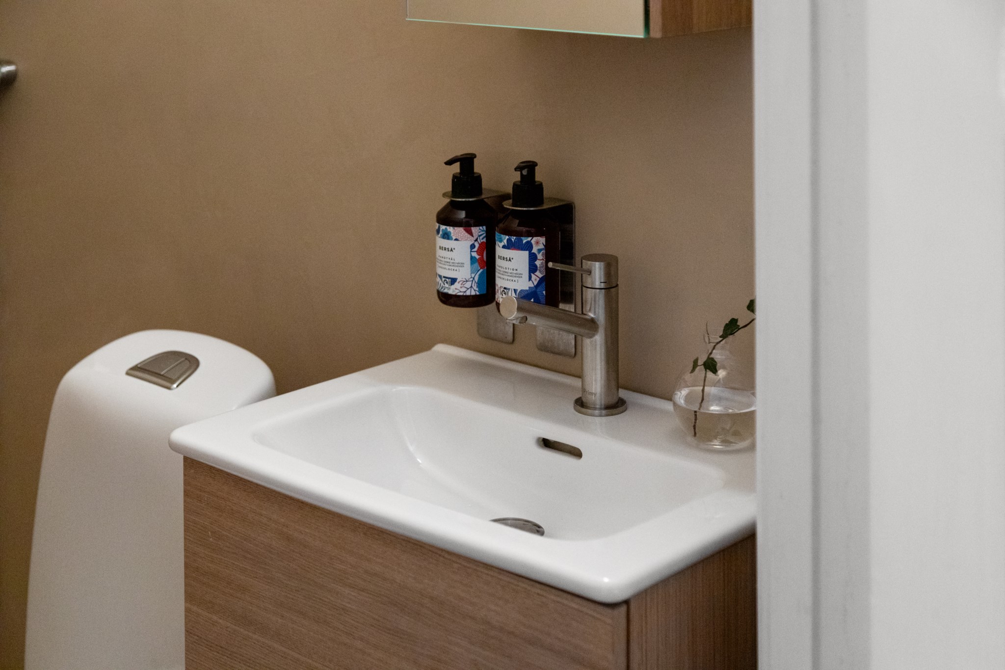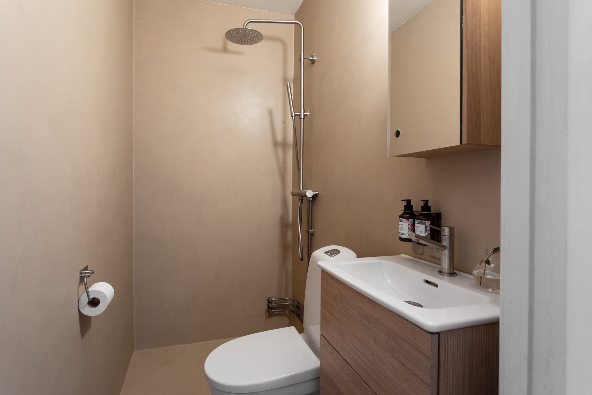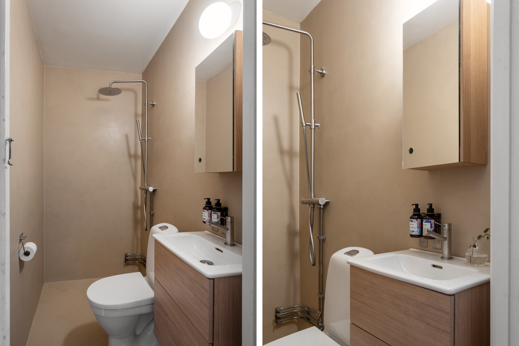Med ytskikt i en beige nyans. Badrummet är utrustat med WC, handfat ovan kommod, spegelskåp, samt dusch.