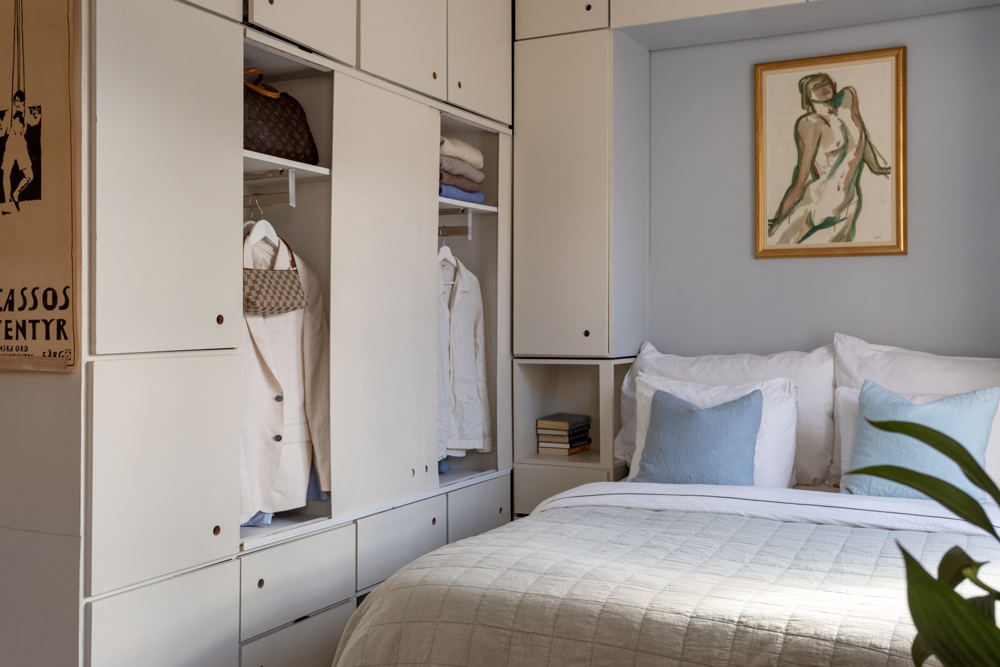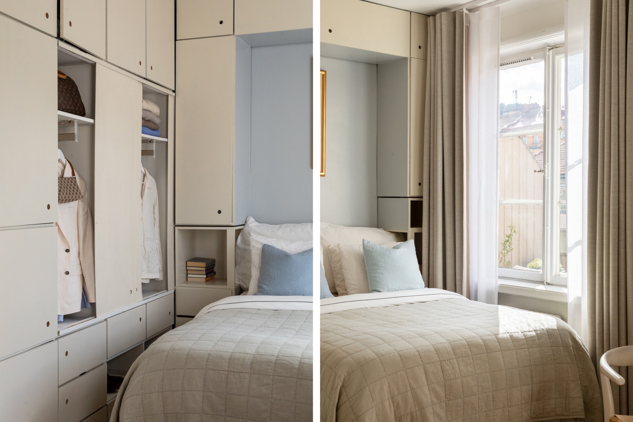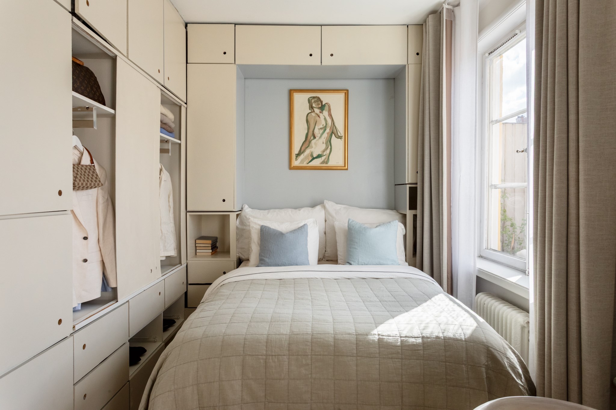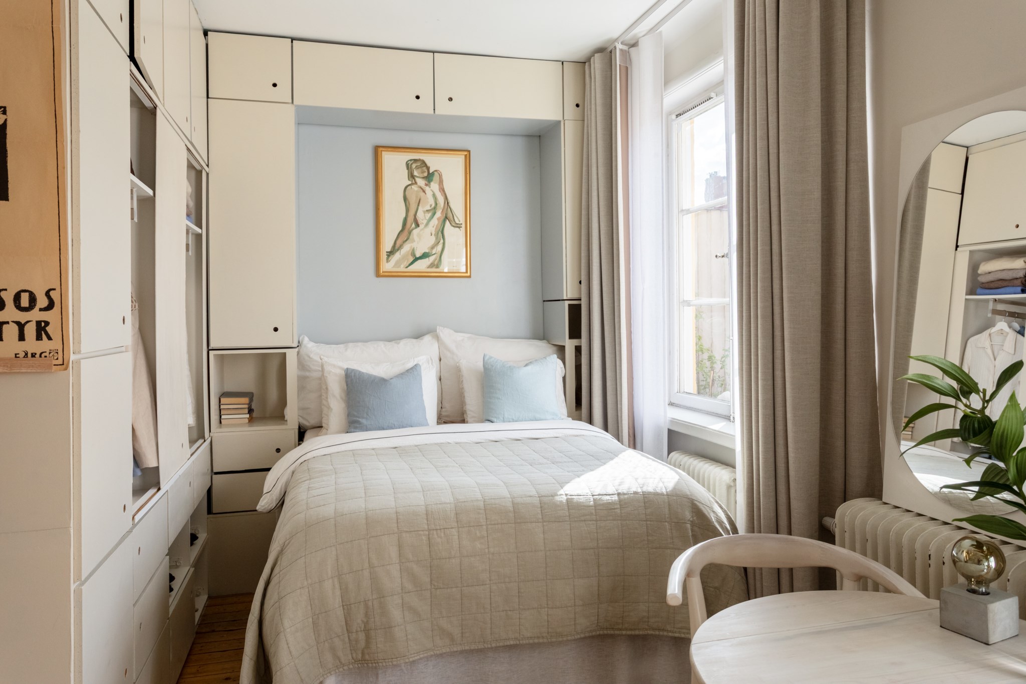Mysig sovalkov med plats för säng och mindre möblemang efter smak och behov. Tidlösa ytskikt bestående av ljusa väggar och ljusa golv. Här möts du av ett härligt ljusinsläpp via ett stort spröjsat fönster.