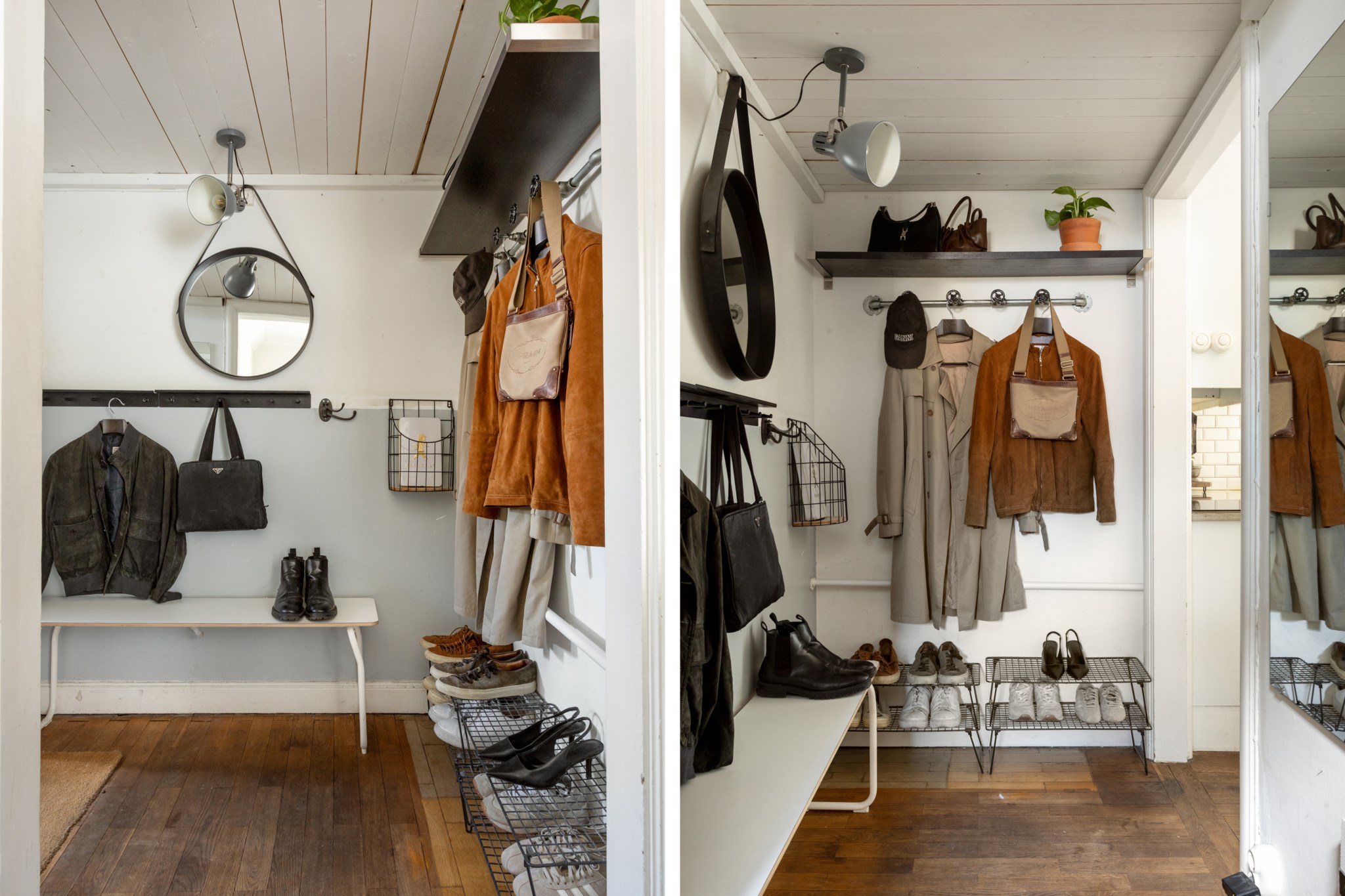 Välkomnande hall med plats för avhängning, skoställ samt mindre avlastningsmöblemang efter smak och behov. Tidlösa ytskikt bestående av ljusa väggar och mörkt trägolv.