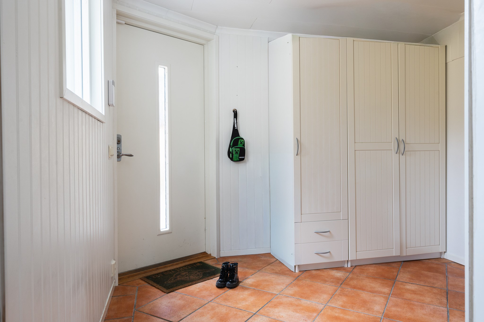 Välkomnande och praktisk hall med gott om förvaring i rymliga garderober och plats för skor. Klinkergolv gör hallen både stilren och lättskött.