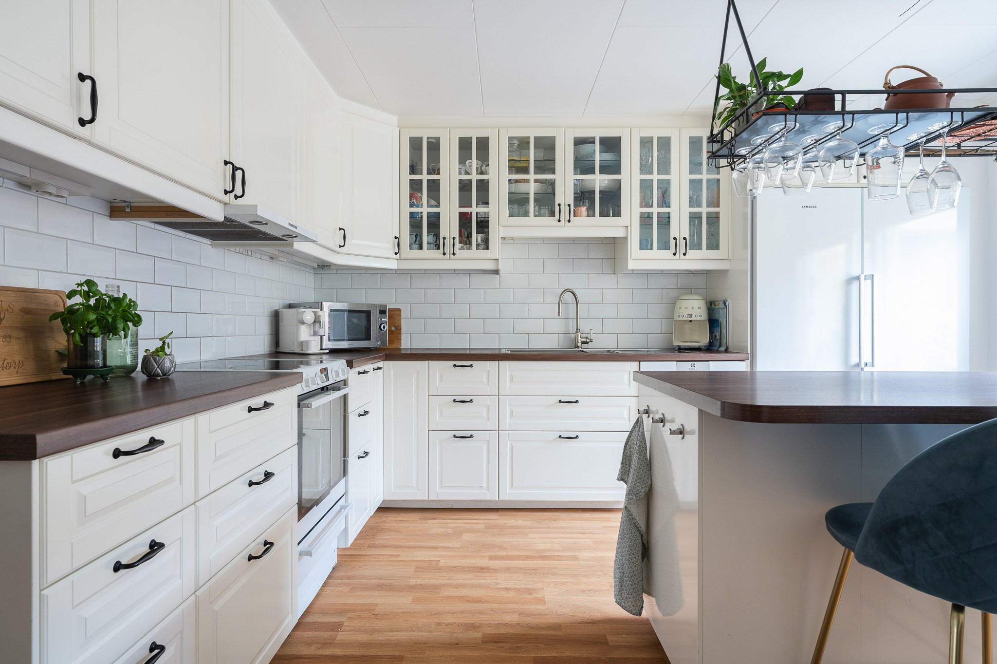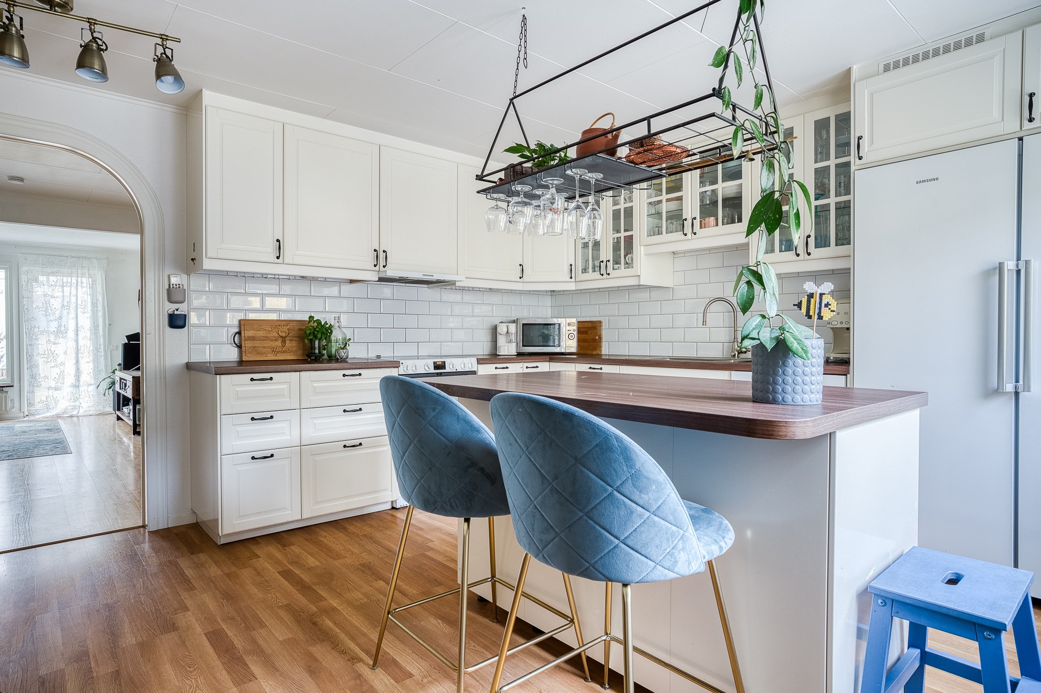 Ljust och luftigt kök med bra arbetsytor, gott om skåpsförvaring och plats för ett större matbord. Här finns fönster mot framsidan, vilket ger ett naturligt ljusinsläpp.