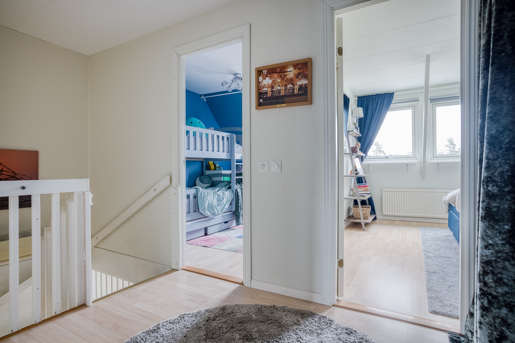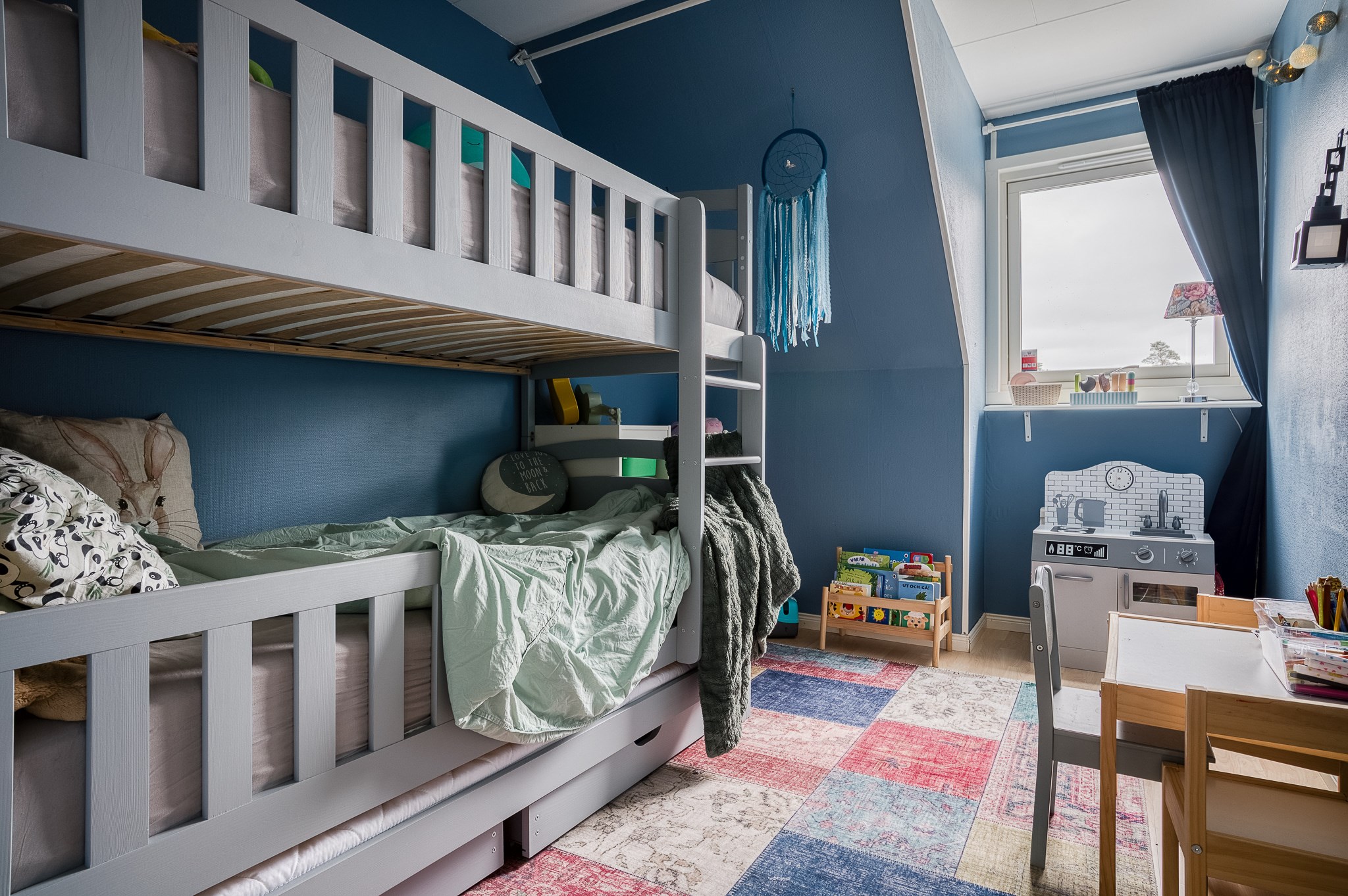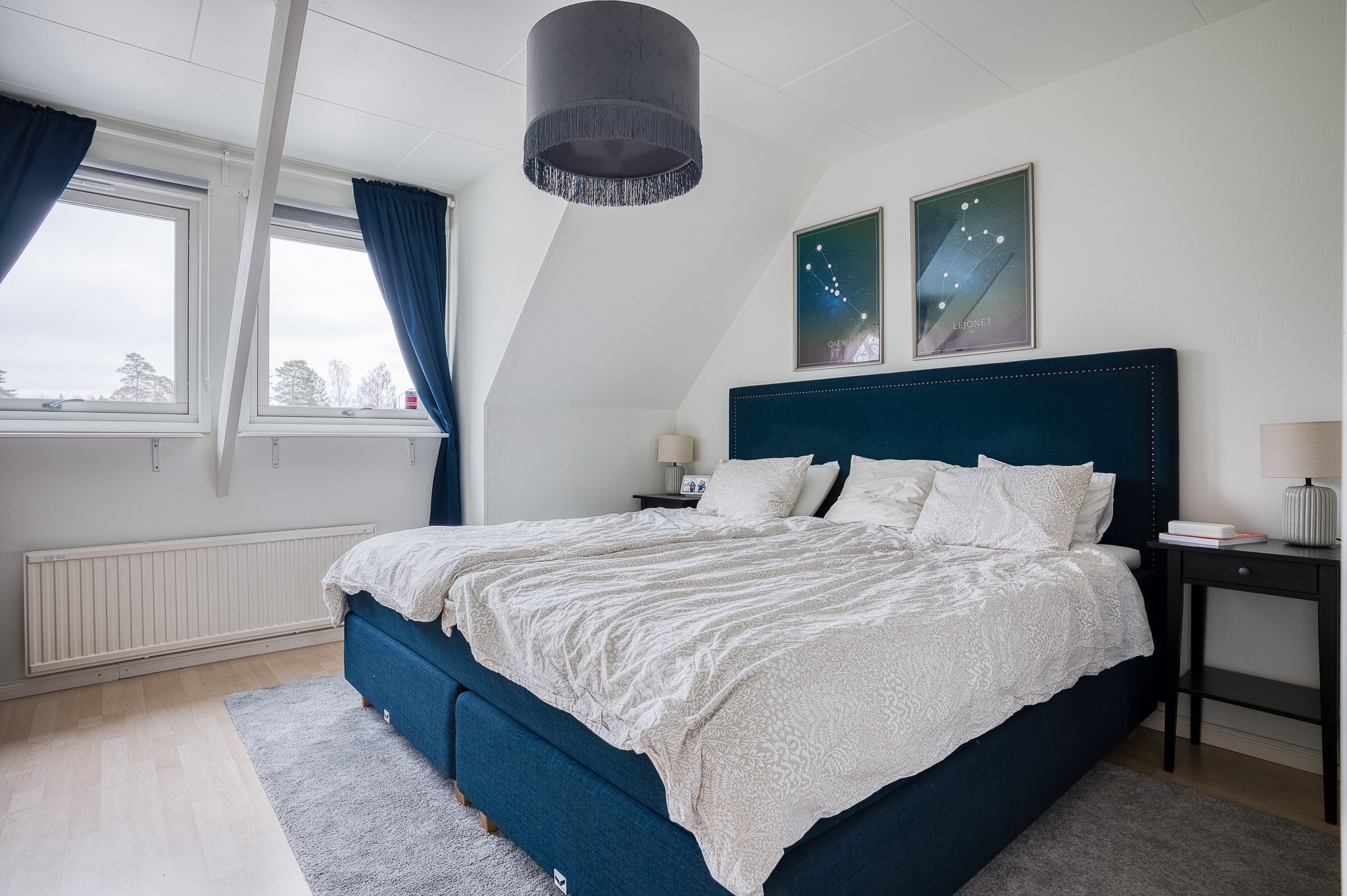Det övre planet rymmer tre rofyllda sovrum i olika storlekar. Perfekta för barn, gäster eller som master bedroom. Ett av sovrummen har dessutom direktaccess till en klädkammare – praktiskt och bekvämt med allt på rätt plats.