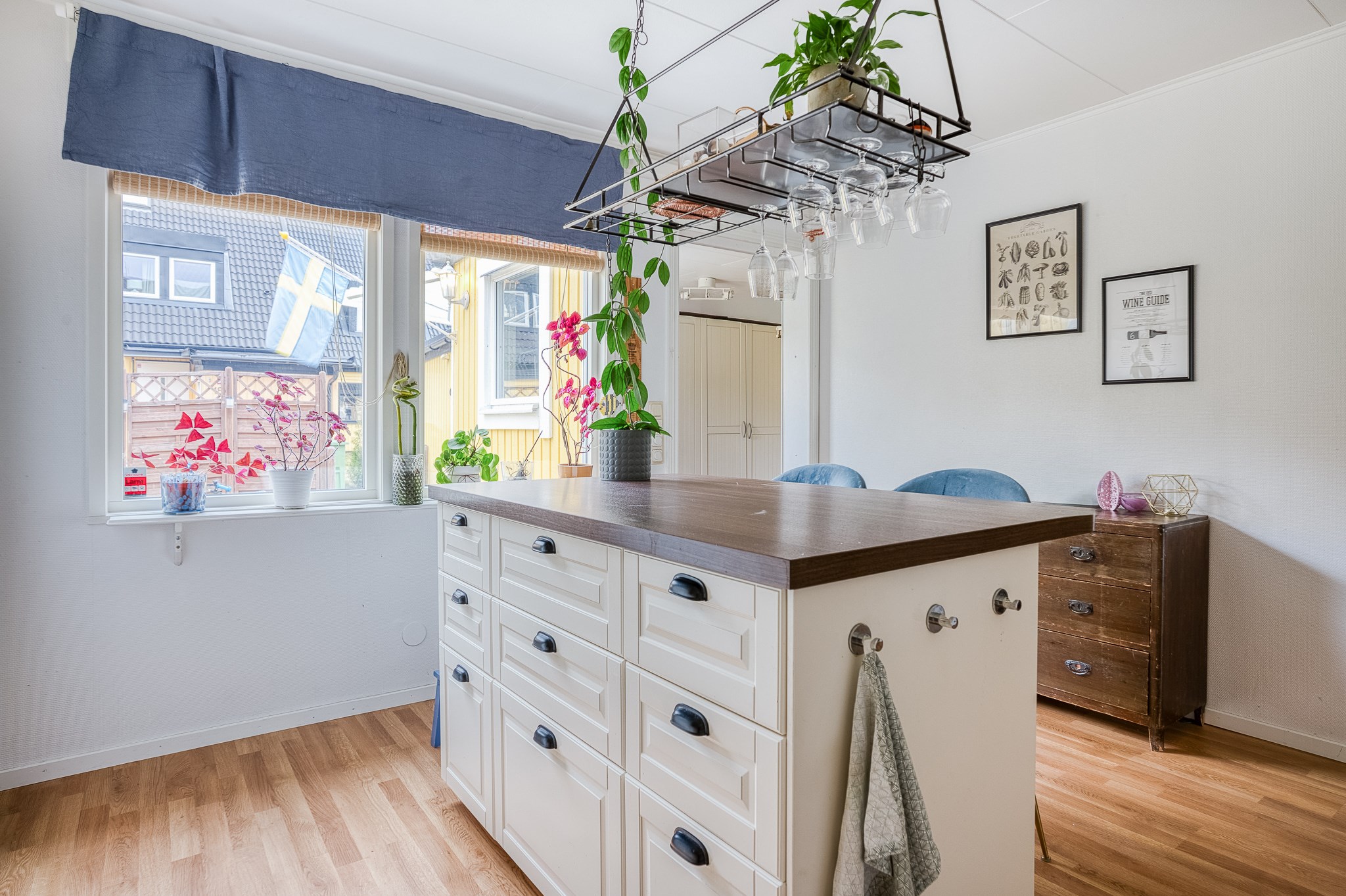 Framsidan bjuder på en härlig solhörna med plats för caféset och blomsterarrangemang, medan baksidan lockar med grönska, förråd, odlingslådor och ett generöst altandäck under tak – perfekt för sommarens middagar eller avkopplande kaffestunder. Ett genomgående välskött och charmigt hem redo att flyttas in i!