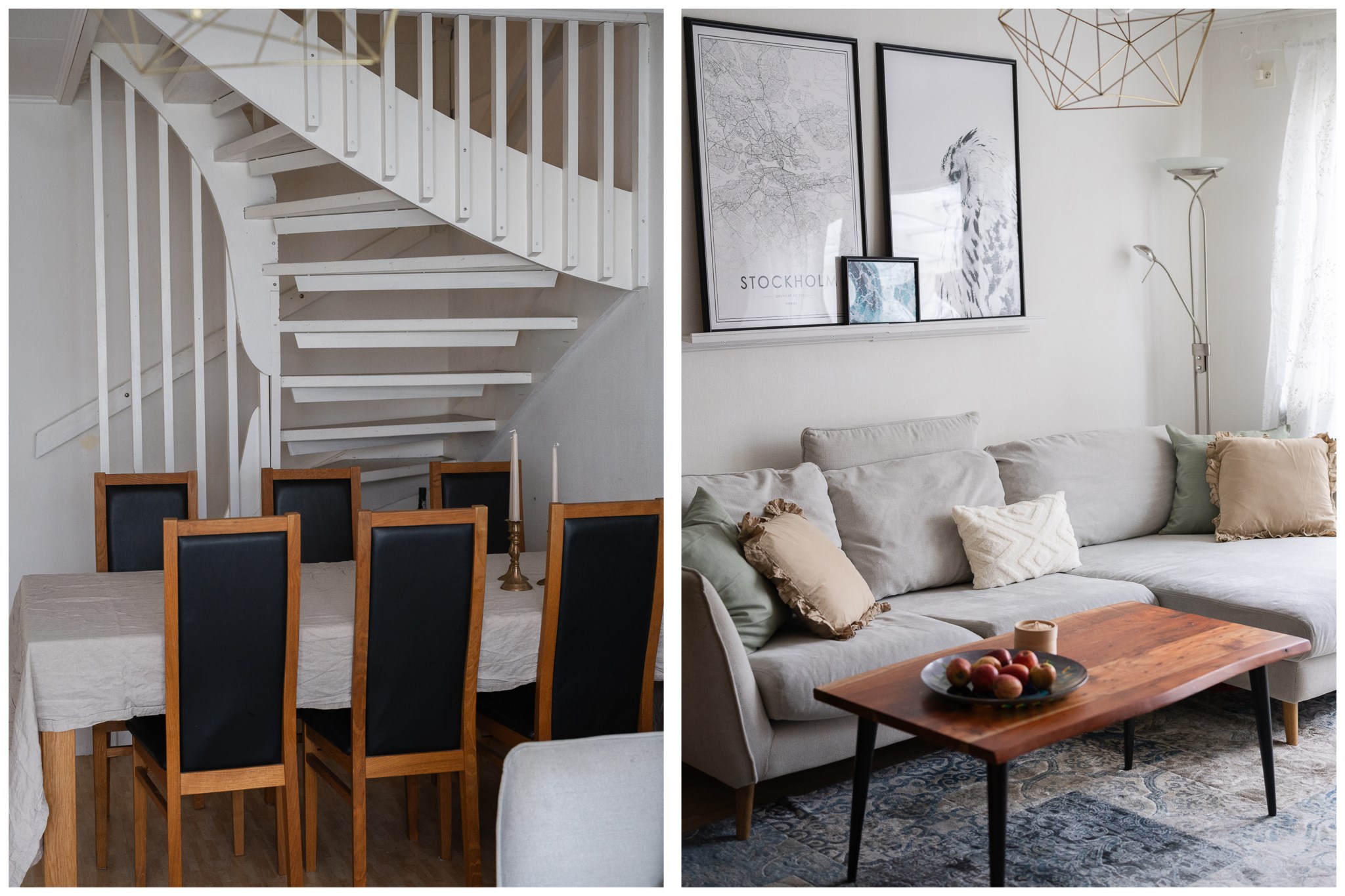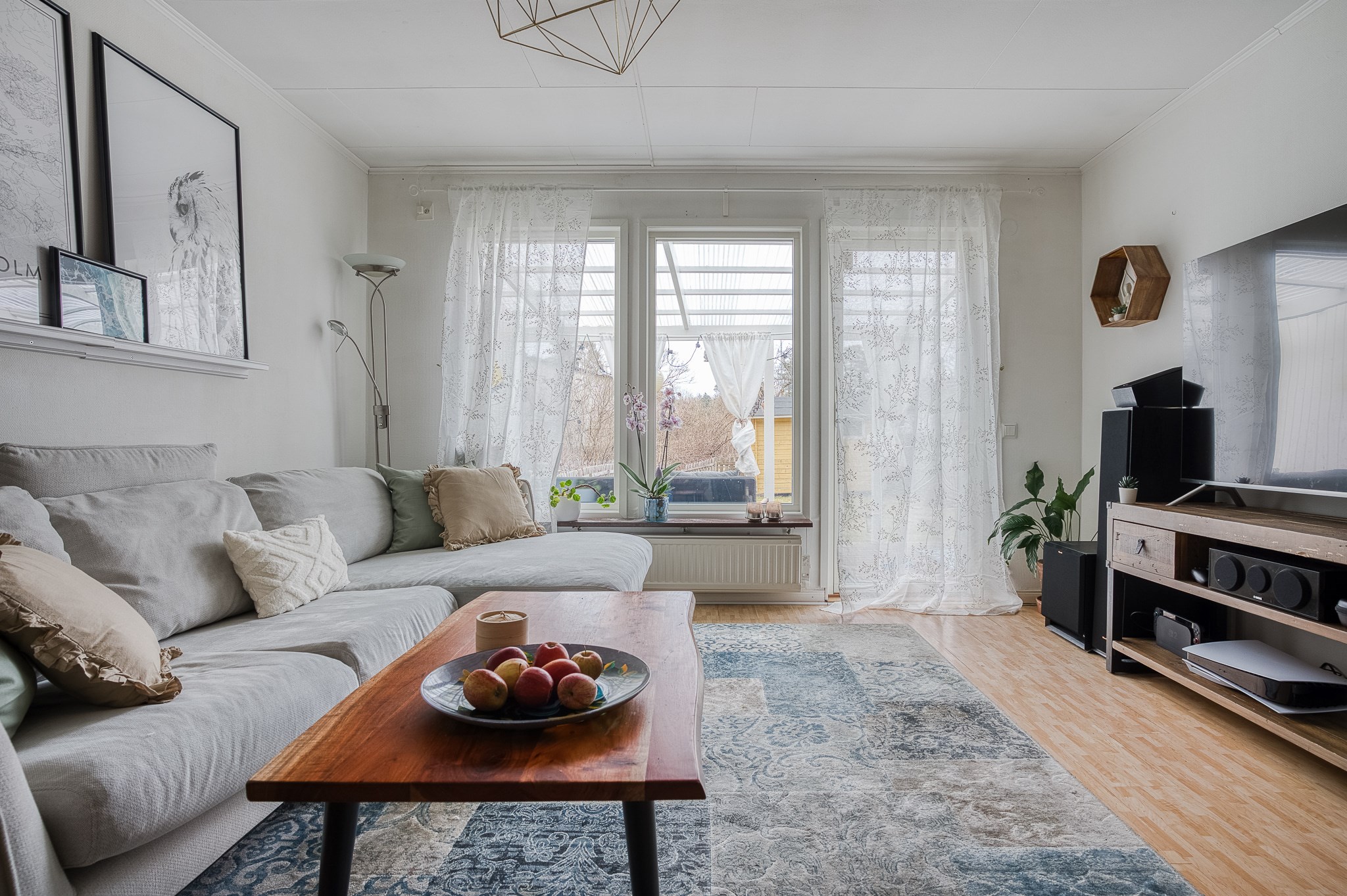 Stort och inbjudande vardagsrum med plats för både soffgrupp och matdel. De stora fönsterpartierna och altandörren suddar ut gränsen mellan inne och ute – härifrån når du direkt det charmiga altandäcket och trädgården.